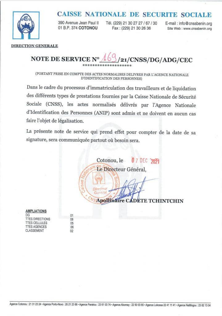 Dans le cadre du processus d'immatriculation des travailleurs et de liquidation des différents types de prestations fournies par la Caisse Nationale de Sécurité Sociale (CNSS), les actes normalisés délivrés par l'ANIP sont admis et ne doivent en aucun cas faire objet de légalisation. C'est ce qu'il faut retenir de la note de service en date du 07 décembre 2021 et signé du Directeur général de la Caisse Nationale de Sécurité Sociale, Monsieur Apollinaire CADETE TCHINTCHIN.