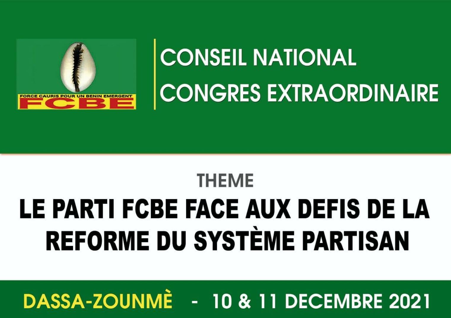 " Le parti Forces Cauris pour un Bénin Émergent (FCBE) face aux défis de la réforme du système partisan ", tel est le thème autour duquel se sont réunis les responsables et militants du parti de l'opposition FCBE pour leur congrès extraordinaire qui s'est tenu ce samedi 11 décembre 2021 à Dassa-Zounmè.