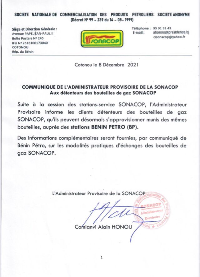 À travers un communiqué en date du 08 décembre 2021, signé par Monsieur Comlanvi Alain HONOU, Administrateur provisoire de la SONACOP. Les clients détenteurs des bouteilles de gaz SONACOP peuvent désormais s'approvisionner munis des mêmes bouteilles auprès des stations BÉNIN PÉTRO (BP).