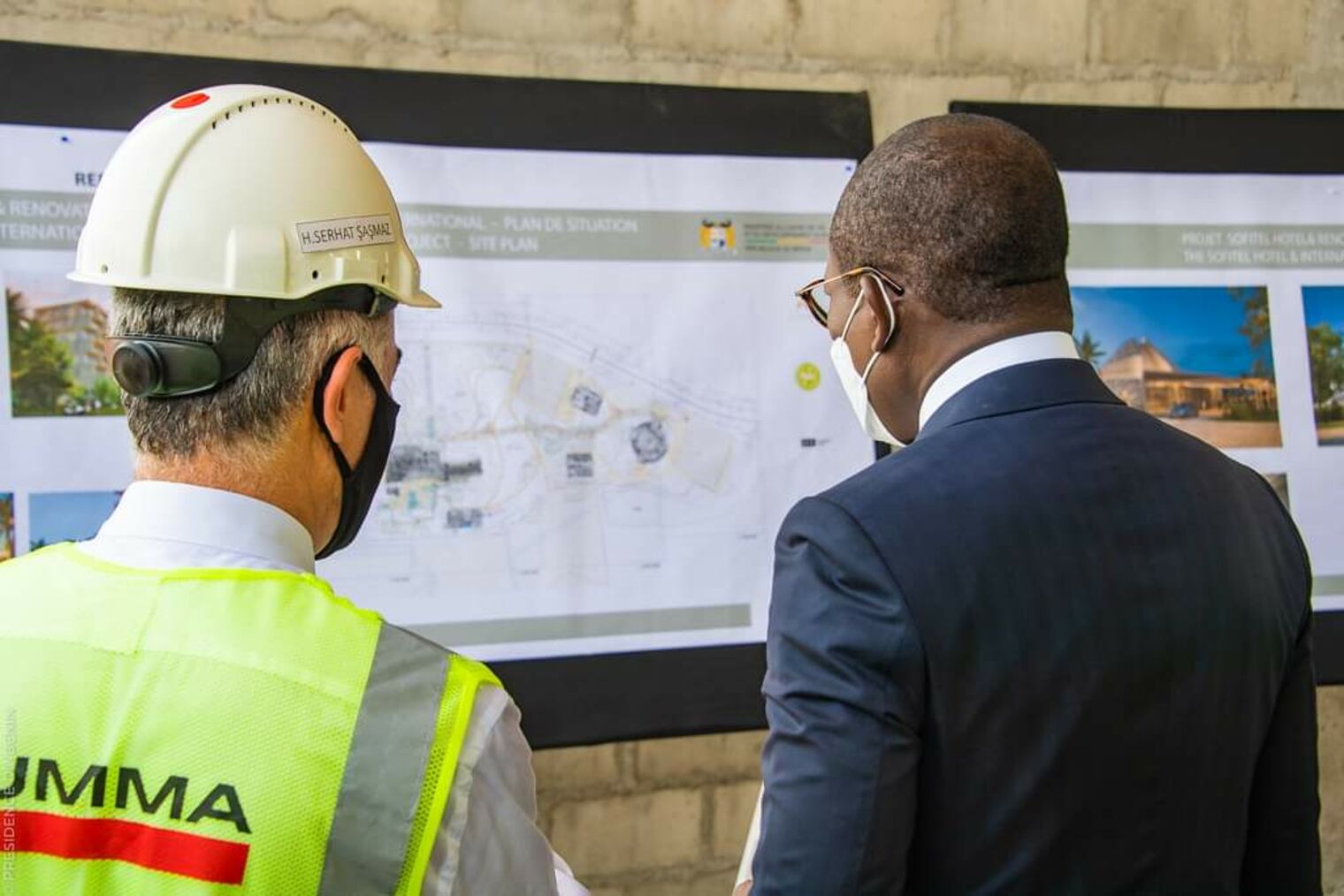 En effet, accompagné des messieurs José TONATO et Jean-Michel ABIMBOLA respectivement ministre du cadre de vie et du développement durable et ministre du tourisme, de la culture et des arts, le Président Patrice TALON a eu droit à une présentation sur l'évolution des travaux par des responsables de l'entreprise SUMMA.