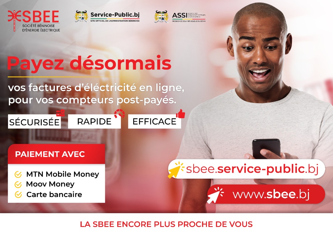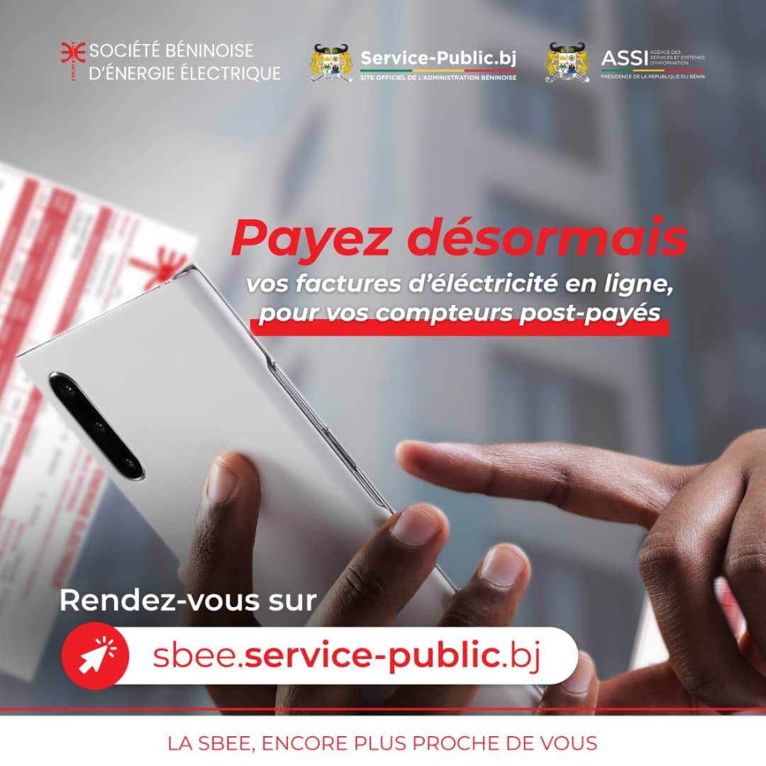Désormais au Bénin, les clients de la Société Béninoise d’Énergie Électrique (SBEE) peuvent payer leurs factures d'électricité pour les compteurs à post-paiement où qu’ils se trouvent et sans se déplacer vers une agence de la SBEE en cliquant sur https://sbee.service-public.bj