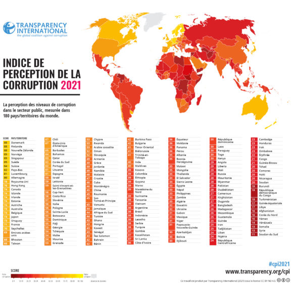 Au regard des multiples résultats obtenus, selon le classement 2021 de Transparency International dévoilé le 25 janvier 2022, le Bénin quitte la 83e place qu'il occupait en 2020 pour la 78e place avec une note de 42/100. Un classement, qui vient corroborer tous les efforts, les actions positives engagées par le Chef de l’État, Monsieur Patrice TALON et son gouvernement dans la lutte contre la corruption.