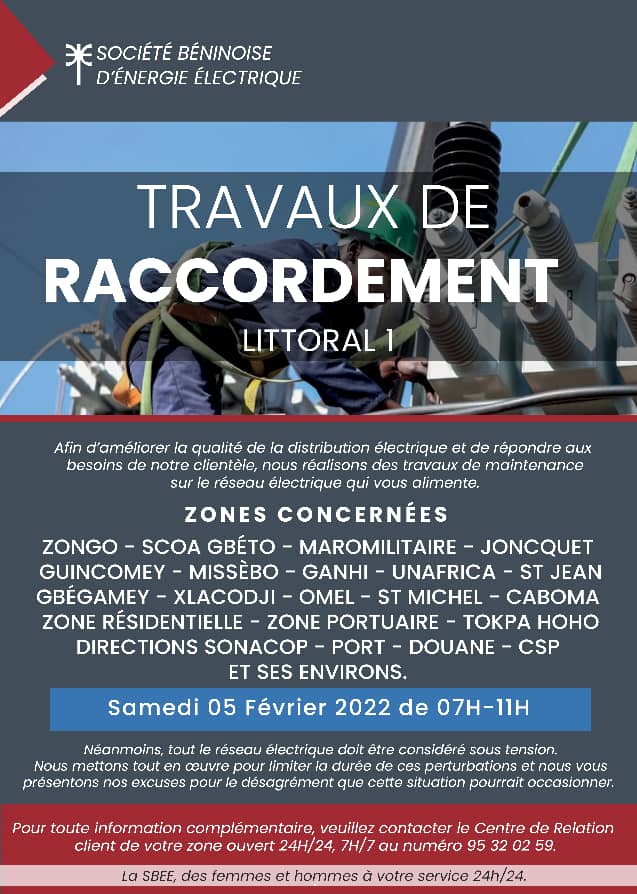 Afin d'améliorer la qualité de la distribution de l'énergie électrique et de répondre aux besoins de sa clientèle, la Société Béninoise d'Energie Électrique (SBEE) réalise des travaux de maintenance sur son réseau électrique ce samedi 05 février 2022 de 07 heures à 11 heures dans plusieurs zones dans le Littoral 1.