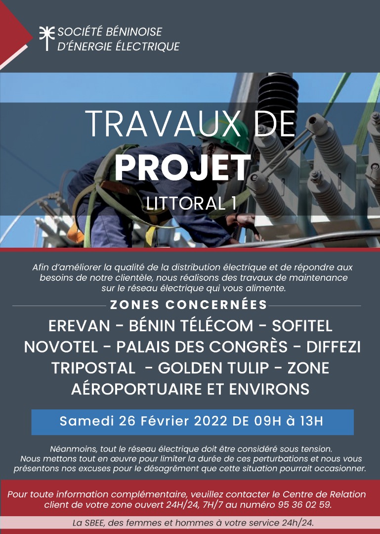 La Direction Générale de la Société Béninoise d'Énergie Électrique (SBEE) informe son aimable clientèle de la région Littoral 1 qu'afin d'améliorer la qualité de la distribution de l'énergie électrique et de répondre aux besoins de la clientèle, elle réalise ce Samedi 26 février 2022 de 09 h à 13h des travaux de maintenance sur le réseau électrique .