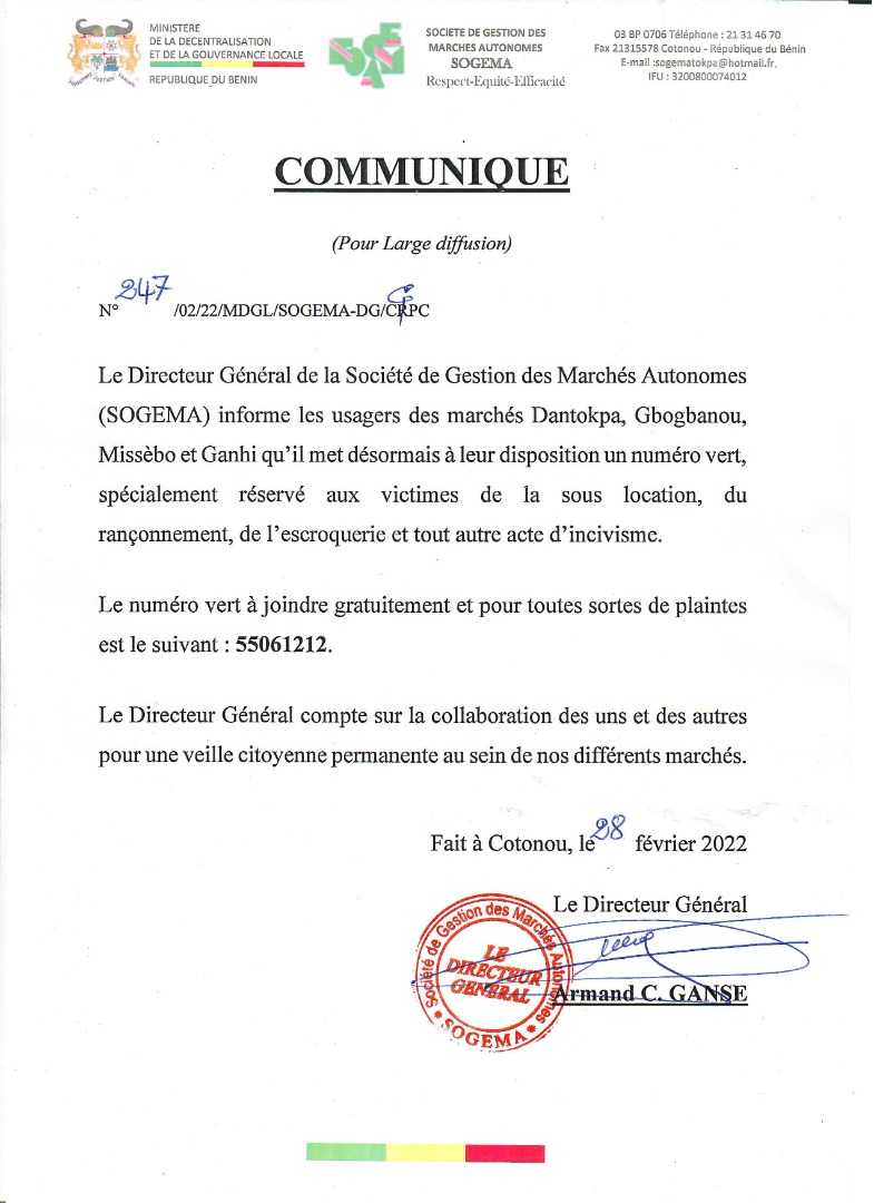 Le 55 06 12 12. C'est le numéro vert que les usagers des marchés Dantokpa, Gbogbanou, Missèbo, Ganhi peuvent désormais appeler gratuitement pour dénoncer tout acte d'escroquerie, de sous-location, de chantage de tout genre ou tout acte d'incivisme auxquels ils seront confrontés.
