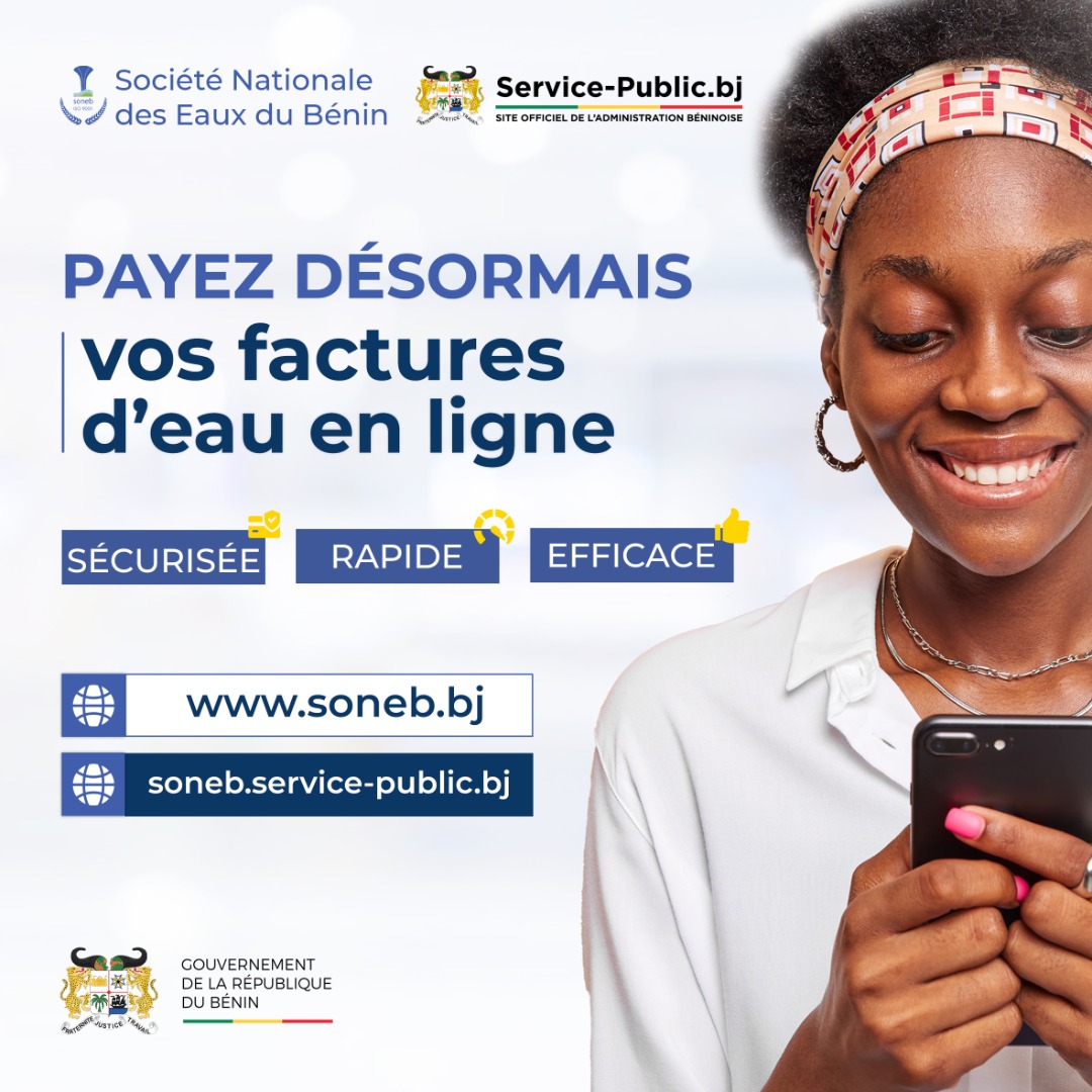 À travers le lien https://soneb.service-public.bj , les abonnés de la SONEB peuvent désormais payer leurs factures d'eau en ligne. Une action qui vient une fois de plus démontrer la volonté du gouvernement du Président Patrice TALON à dématérialiser les services publics dans tous les secteurs et domaines d'activités.