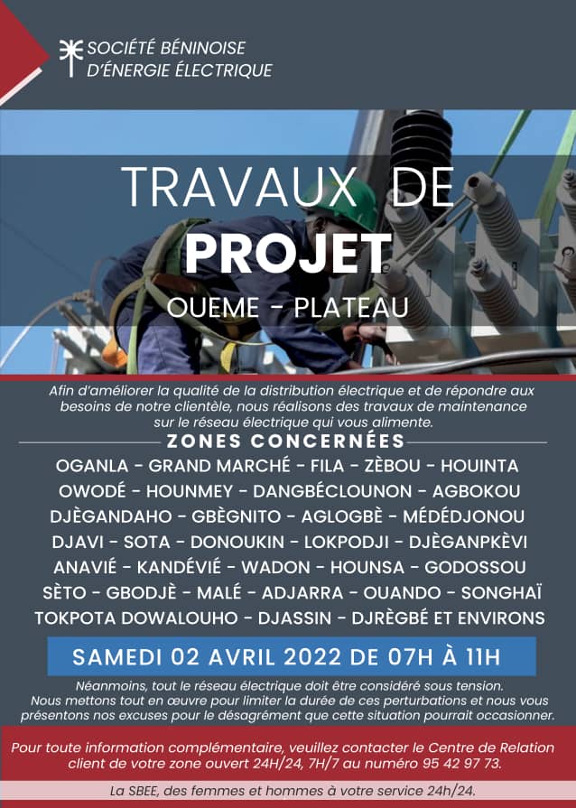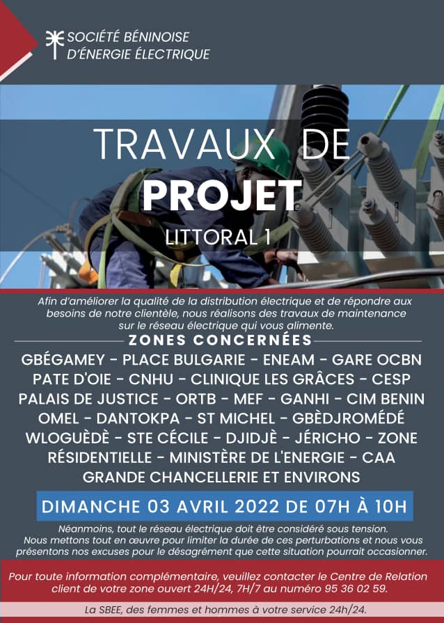 La Direction de la Société Béninoise d'Énergie Électrique (SBEE) informe son aimable clientèle du Littoral 1 et de l'Ouemé-Plateau que dans le cadre des travaux de Projet, elle effectuera des travaux de maintenance sur le réseau électrique afin d'améliorer la qualité de la distribution électrique.