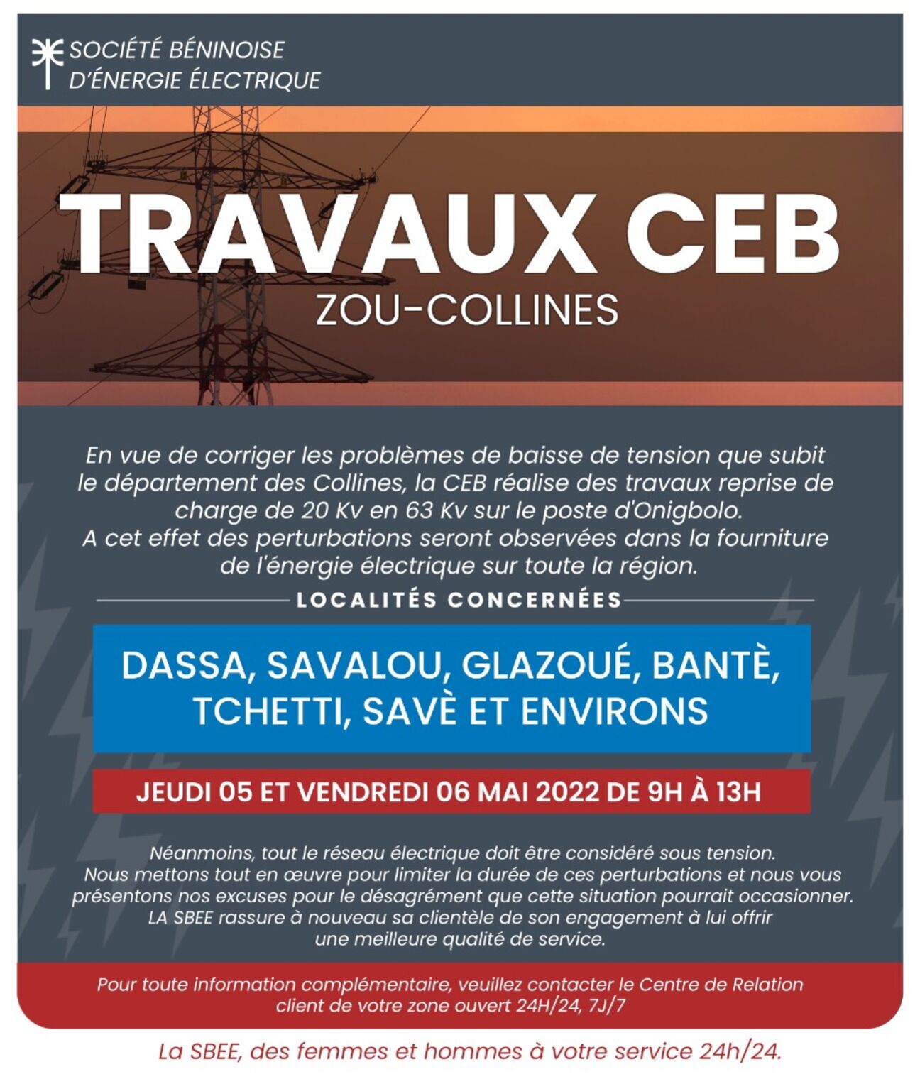 La Société Béninoise d'Énergie Électrique (SBEE) informe son aimable clientèle, qu'à la suite de l'avarie du transformateur au poste de Bohicon qui entraîne des perturbations dans la fourniture de l'énergie électrique dans les départements du Zou et des Collines depuis le 22 avril 2022, la Communauté Électrique du Bénin (CEB) effectue des travaux de reprise de charge de 20 Kv en 63 Kv sur le poste d'Onigbolo le jeudi 05 et le vendredi 06 mai 2022 .