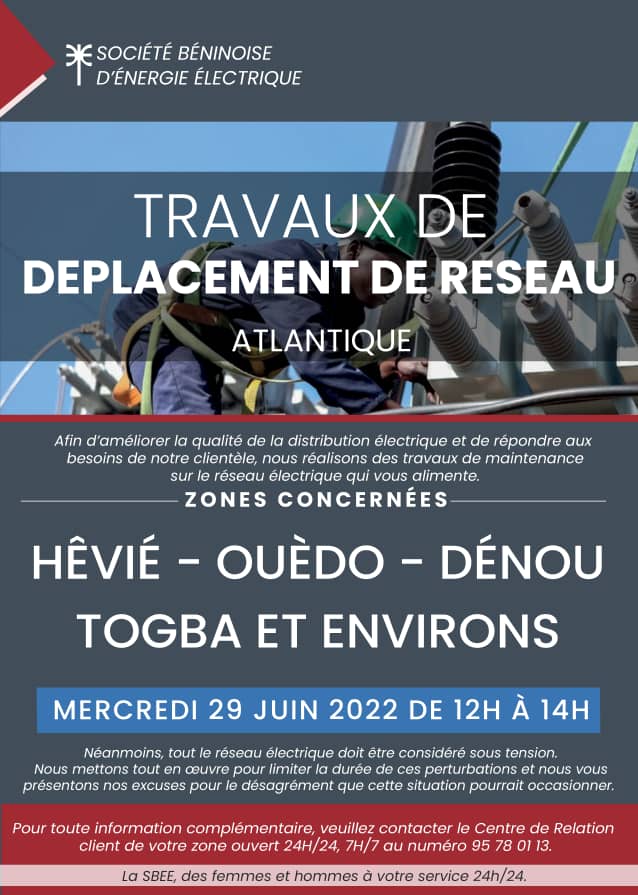 Afin d'améliorer la qualité de la distribution électrique et de répondre aux besoins de la clientèle, la Société Béninoise d'Energie Électrique (SBEE) procède ce mercredi 29 juin 2022 à des travaux de déplacement de réseau dans le département de l'Atlantique. Les dits travaux prévus pour se dérouler entre 12 H et 14 H concernent les localités de HÊVIÉ, OUÈDO, DÉNOU, TOGBA et environs.