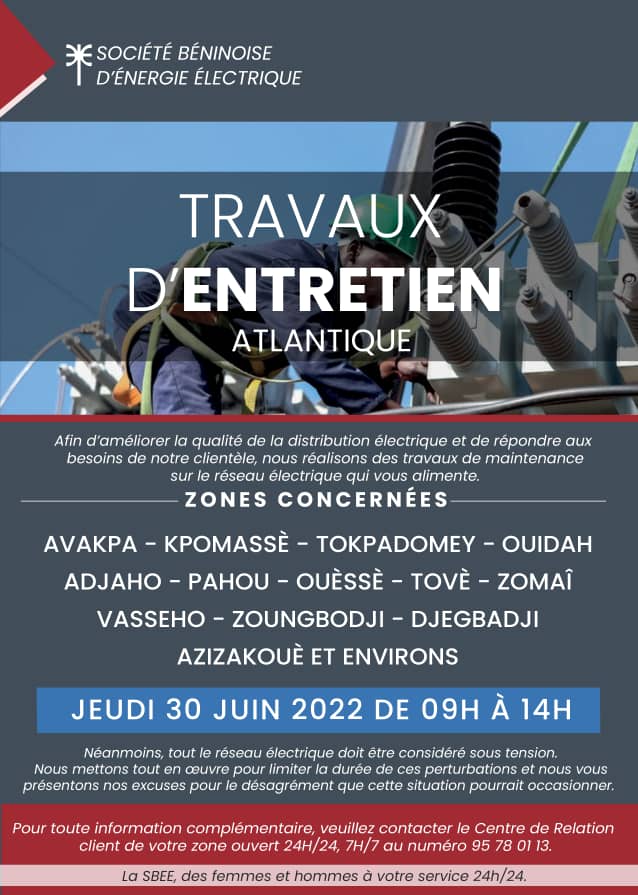 Afin d'améliorer la qualité de la distribution électrique et de répondre aux besoins de la clientèle, la Société Béninoise d'Énergie Électrique (SBEE) effectue ce jeudi 30 juin 2022 de 09 h à 14 h des travaux d'entretien dans le département de l'Atlantique. Les dits travaux sont prévus pour se dérouler dans les zones ci-après :