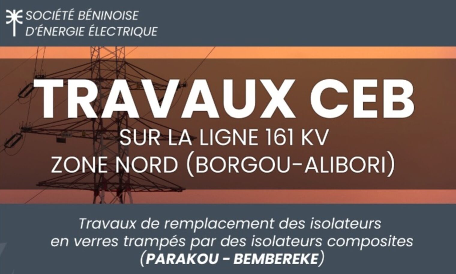 La Société Béninoise d’Énergie Électrique (SBEE) informe son aimable clientèle de la Zone Nord Borgou-Alibori que la Communauté Électrique du Bénin (CEB) effectue des travaux de remplacement des isolateurs en verres trempés par des isolateurs composites sur la ligne 161 KV PARAKOU-BEMBÈRÈKÈ.