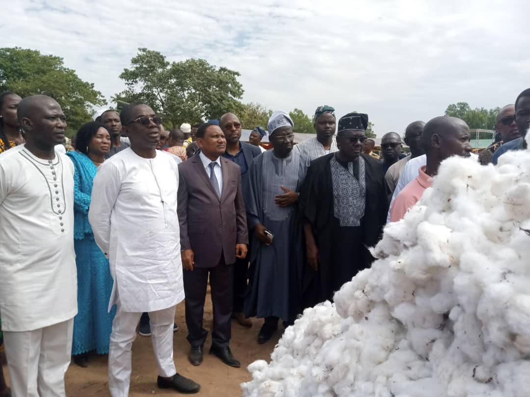 La cérémonie de lancement officiel de la campagne de commercialisation du coton graine a eu lieu ce jeudi 14 novembre 2019 à Banikoara dans le département de l'Alibori en présence des Ministres du gouvernement ainsi que des personnalités dont le Président de la Fédération nationale des coopératives villageoises de producteurs de coton Gani Badou TAMOU, le Président du Conseil national des égreneurs Eustache KOTINGAN, le Président de la HAAC Rémi Prosper MORETTI et sa Majesté NANSOUNON.