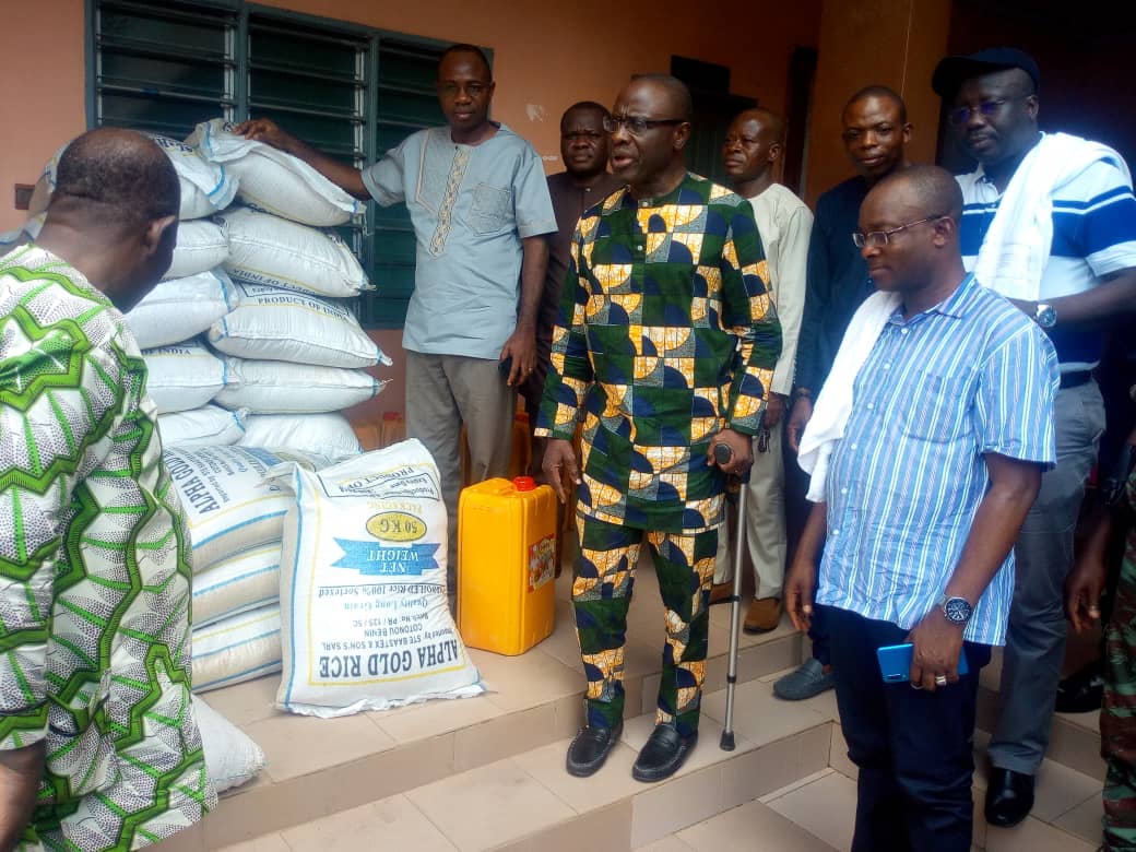 Les bras chargés de sacs de riz, du maïs et des bidons d’huile végétale, Nestor WADAGNI, Vice-président du Conseil Économique et Social (CES) et représentant du ministre de l’Économie et des Finances est allé ce samedi 16 novembre 2019, soulager les peines des sinistrés des dernières inondations dues à la crue du fleuve Mono, de Ouèdèmè, Atikpéta dans la Commune de Lokossa et d'Athiémé. Il était entouré pour la circonstance de plusieurs élus locaux des différentes communes.