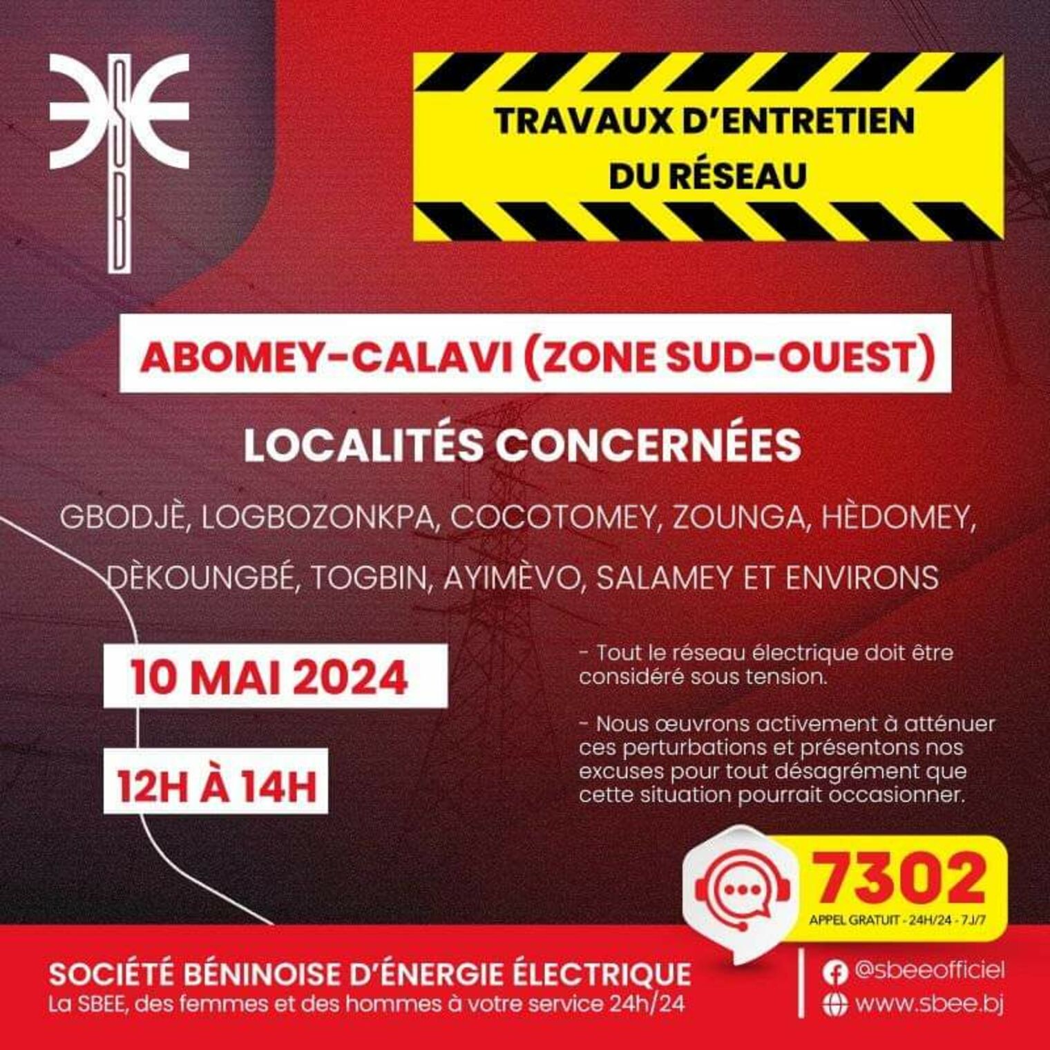 Ces travaux qui pourraient entraîner des perturbations dans la fourniture de l'énergie électrique et qui concernent les localités comme : GBODJÈ, LOGBOZOUNKPA, COCOTOMEY, ZOUNGA, HÈDOMEY, DÈKOUNGBÉ, TOGBIN, AYIMÈVO, SALAMEY et environs, auront lieu ce Vendredi 10 mai 2024 de 10h à 14h.