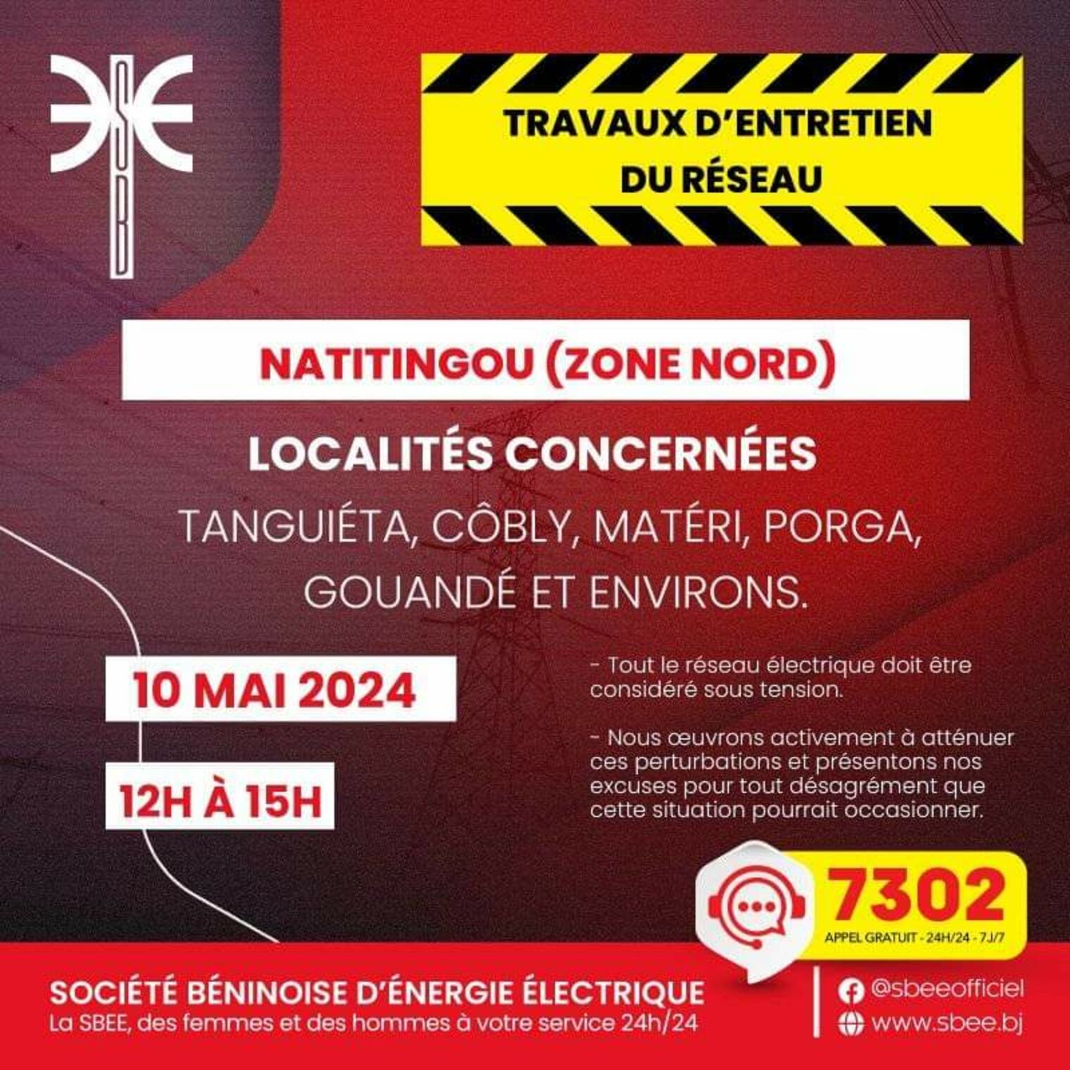La Société Béninoise d’Énergie Électrique (SBEE) informe son aimable clientèle des localités de : TANGUIÉTA, Cobly, MATÉRI, PORGA, GOUANDÉ et environs que, dans le but d'améliorer la qualité de service, elle entreprendra des travaux de maintenance sur son réseau électrique. Cela pourrait entraîner des perturbations dans la fourniture de l'énergie électrique.