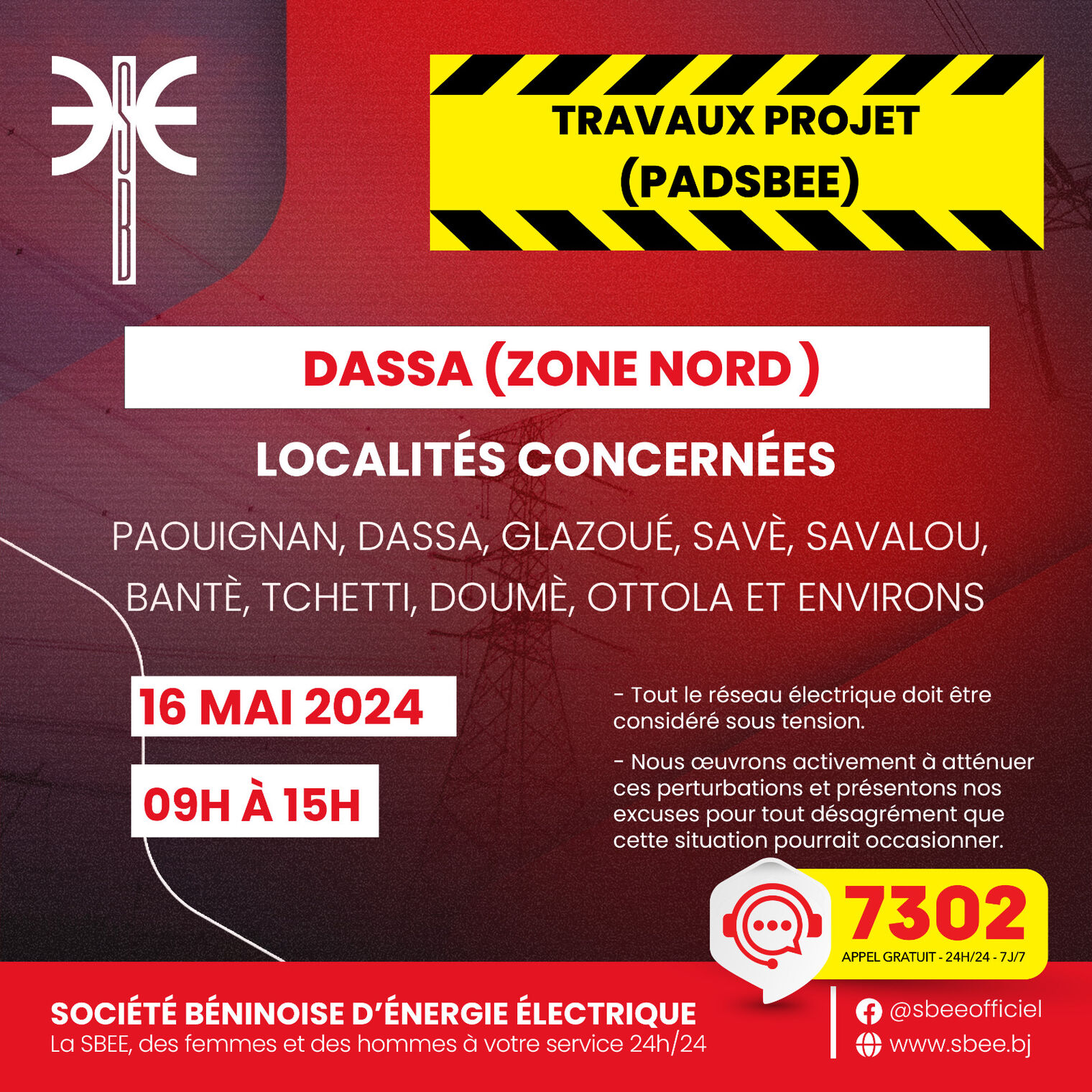 La Société Béninoise d’Énergie Électrique (SBEE) informe son aimable clientèle que, dans le cadre des travaux de construction de nouveaux postes sources et de nouvelles lignes HTB par le « Projet d'Accès Durable et Sécurisé du Bénin à l'Énergie Électrique - PADSBEE », des perturbations seront enregistrées dans la fourniture de l’énergie électrique le jeudi 16 mai 2024, de 09H à 15H dans les localités de PAOUIGNAN, DASSA-ZOUNMÈ, GLAZOUÉ, SAVÈ, SAVALOU, BANTÈ, TCHETTI, DOUMÈ, OTTOLA et ENVIRONS.
