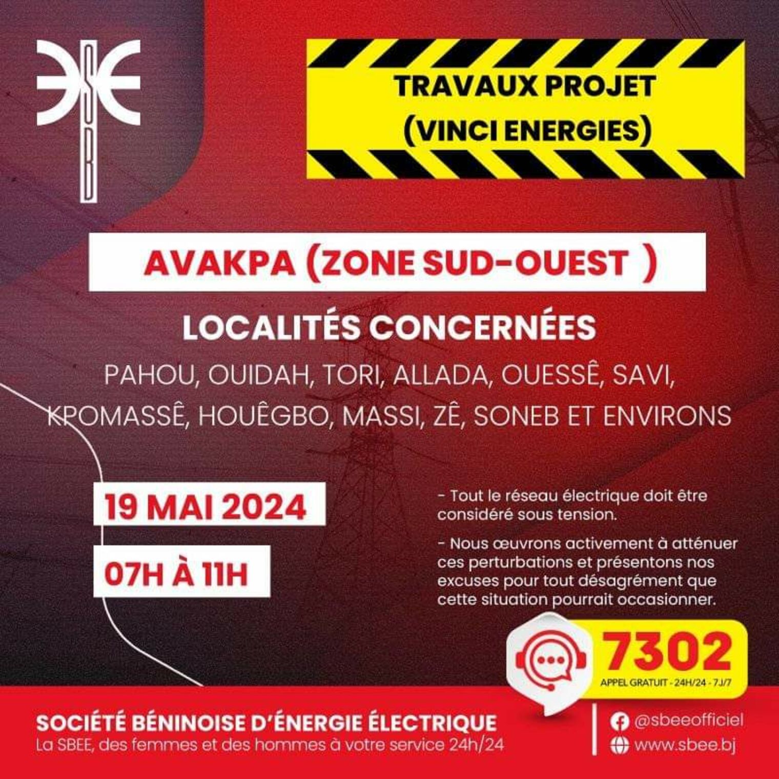 La Société Béninoise d’Énergie Électrique (SBEE) informe son aimable clientèle des localités de : PAHOU, OUIDAH, TORI, ALLADA, OUESSÊ, SAVI, KPOMASSÈ, HOUÈGBO, MASSI, ZÈ, SONEB ET ENVIRONS que des travaux de maintenance sont prévus sur le réseau électrique. Pour mener à bien ces travaux, des perturbations seront enregistrées dans la fourniture d'énergie électrique.