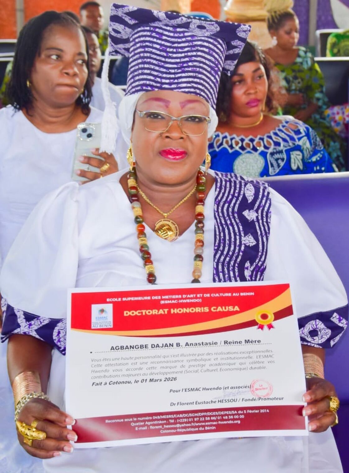 Dans la dynamique d'une rare élévation symbolique, l'École Supérieure des Métiers, Arts et Culture du Bénin (ESMAC) a conféré, le 1er mars 2026, le titre de Docteur Honoris Causa à Sa Majesté la Reine-Mère Noutchewe AHANTOUN-AGBANGBE AKABA DAJAN. Cette cérémonie, empreinte de solennité, s'est déroulée au Temple des Grandes Victoires de Rabbi Tan, sous l'égide du Dr Florent Eustache HESSOU, Recteur de l'institution.