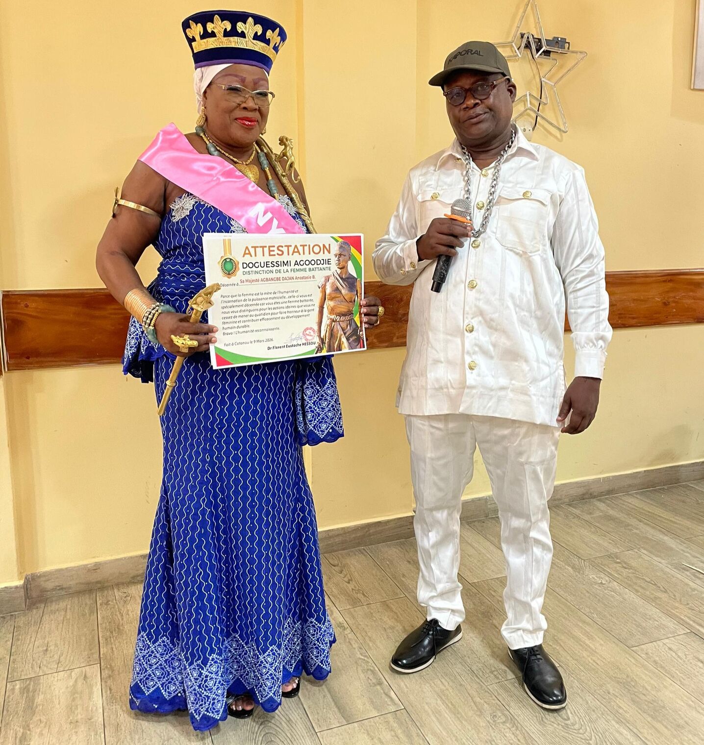 La cérémonie, fort simple, s’est déroulée à Cotonou en présence d’éminentes personnalités politico-administratives. Le promoteur de la distinction, Dr Florent Eustache HESSOU, a souligné la portée symbolique de cet hommage : « La femme est la mère de l’humanité et l’incarnation de la puissance matricielle… Celle-ci vous est spécialement décernée parce que vous êtes une femme battante ».