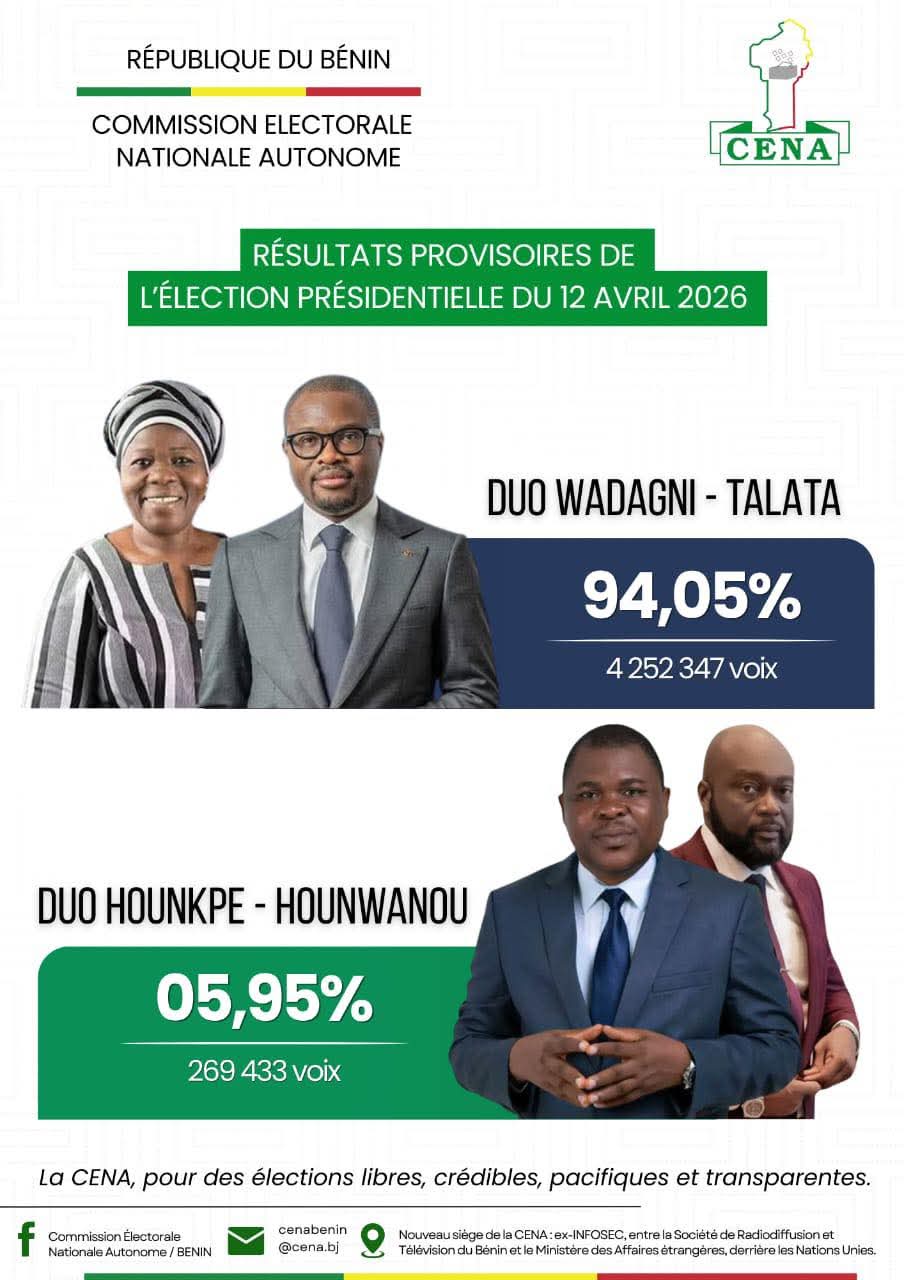 Les résultats provisoires publiés par la Commission Électorale Nationale Autonome (CENA) confirment ce que beaucoup anticipaient déjà : Romuald WADAGNI s’impose très largement à l’issue du scrutin présidentiel. Avec un score écrasant, le candidat soutenu par le pouvoir consolide son statut de successeur naturel dans la continuité de la gouvernance actuelle.
