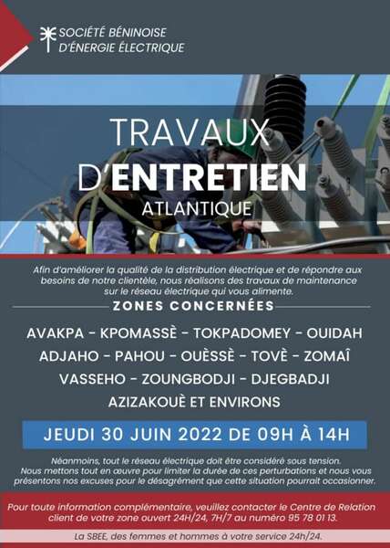 SBEE / Travaux d'entretien dans l'Atlantique : Voici le jour et les zones concernées